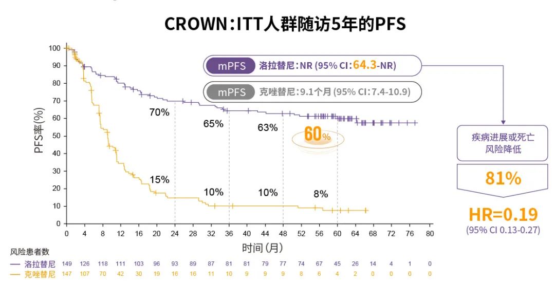 历经5年随访,CROWN试验的PFS生存曲线继续呈现“长拖尾”,一线mPFS创新记录,HR值更低。具体而言,洛拉替尼的PFS数据有以下特点: