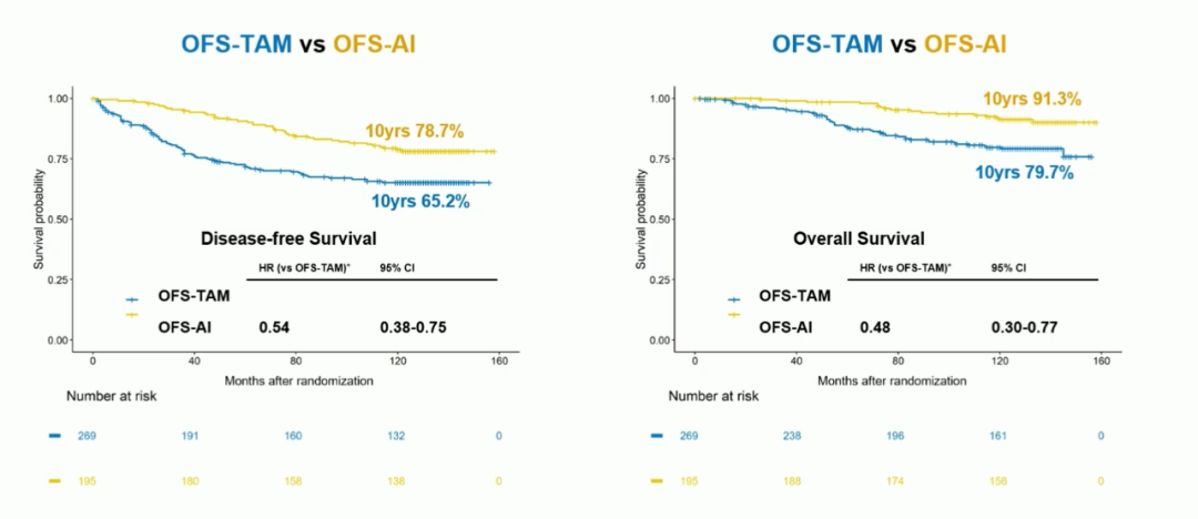 研究结果:研究共纳入965名患者,其中501名(51.9%)仅接受了TAM治疗,464名(48.1%)接受了OFS联合内分泌治疗(TAM[n=269,27.9%]或依西美坦[n=195,20.2%])。联用OFS组患者的10年DFS(OFS 70.9%vs.非OFS 59.6%,P<0.001)和OS(OFS 84.7%vs.非OFS 74.0%,P<0.001)明显更好。同时,OFS的加用与预后改善呈现独立相关性。在内分泌治疗联合OFS组中,使用AI治疗的患者显示出更好的DFS(HR 0.44;95%CI:0.29~0.68;P<0.001)和OS(HR 0.43;95%CI:0.18~0.60;P<0.001)。