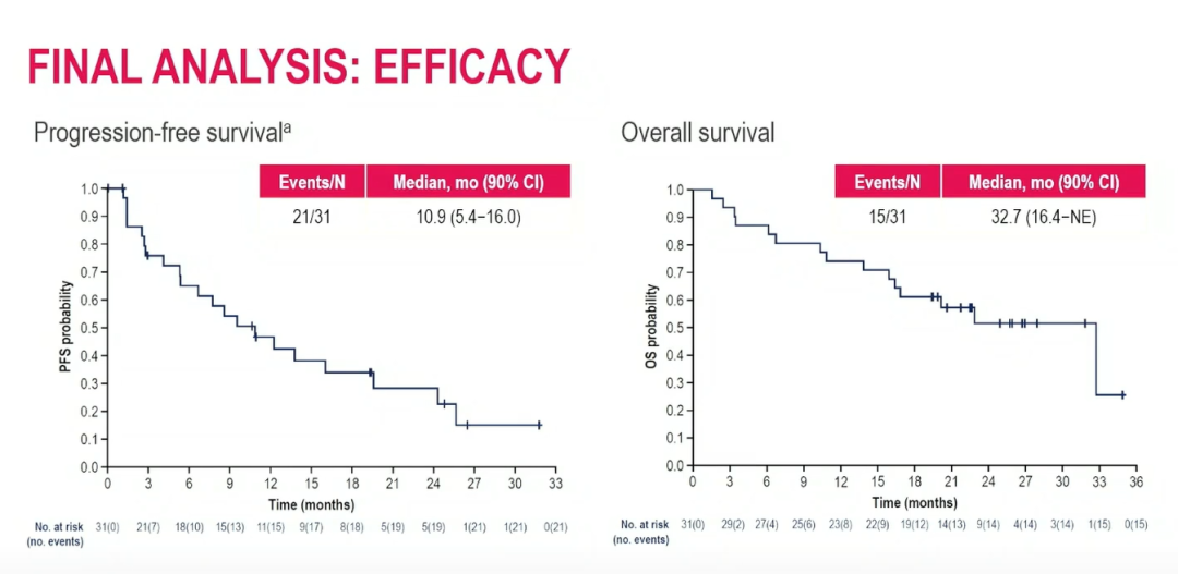 mPFS为10.9个月(90%CI:5.4~16.0)。mOS为32.7个月(90%CI:16.4~不可估计)。