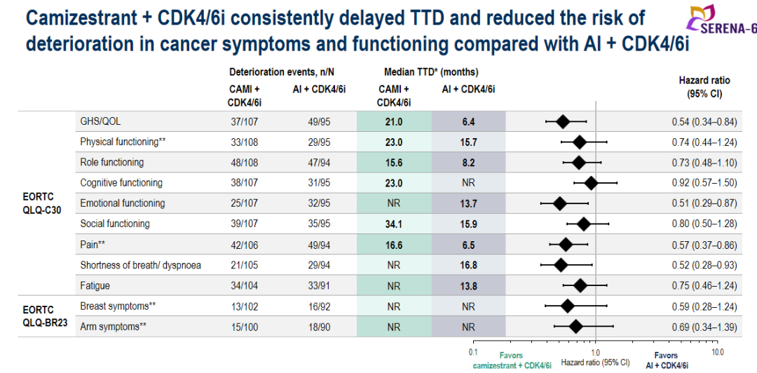 结果显示,Camizestrant组(n=157)和AI组(n=158)间的EORTC QLQ-C30及EORTC QLQ-BR23基线评分相似。与AI组相比,切换至Camizestrant组治疗的患者延迟了疼痛(HR 0.57;95%CI:0.37-0.86)、疲劳(HR 0.75;95%CI:0.46-1.24)、气短/呼吸困难(HR 0.52;95%CI:0.28-0.93)等至疾病恶化时间(TTD)。