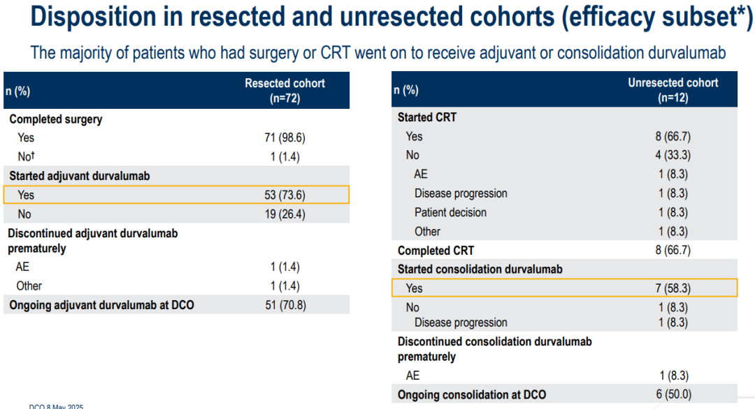 ☆根治性放化疗队列:对于在新辅助治疗后变为不可切除或再次被归类为不可切除的患者:66.7%完成了根治性放化疗,58.3%开始了度伐利尤单抗巩固治疗,其中一半在数据截止时仍在治疗中。