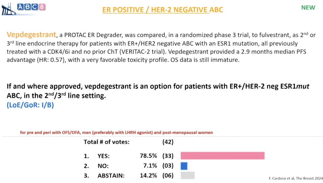 Vepdegestrant(一种PROTAC雌激素受体降解剂)在一项随机III期试验(VERITAC-2)中,与氟维司群进行了比较。该试验针对携带ESR1突变、既往均接受过CDK4/6i治疗且未接受过化疗的ER+/HER2-晚期乳腺癌患者,用于其二线或三线内分泌治疗。Vepdegestrant治疗带来了2.9个月的中位PFS改善(风险比:0.57),且安全性特征良好。OS数据尚不成熟。