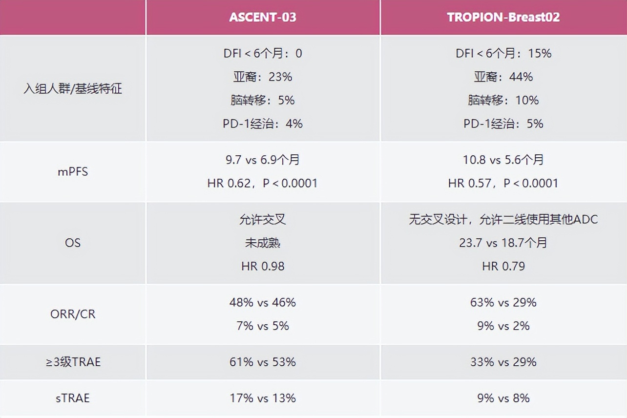 这两项研究存在一些异同。二者均取得PFS的显著改善,ASCENT-03、TROPION-Breast02研究的风险比为0.62和0.56,处于相似范围。目前,ASCENT-03研究的OS数据尚未成熟,而TROPION-Breast02研究取得PFS和OS双阳性结果,目前OS显示约改善超过5个月。