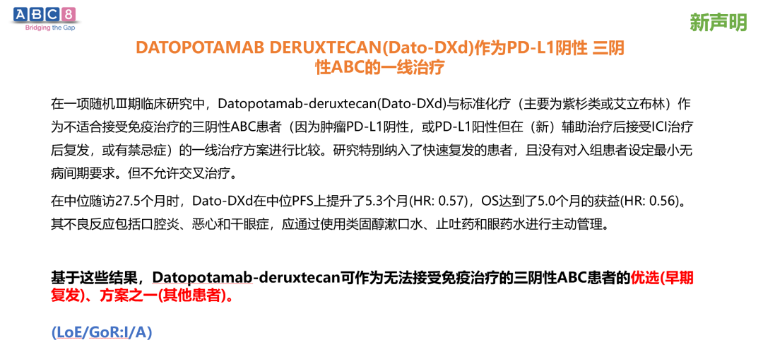《肿瘤瞭望》:在ABC8有关mTNBC的推荐更新部分,基于TB-02研究结果,大会讨论中不仅推荐Dato-DXd作为不适合免疫治疗的mTNBC一线治疗选择之一,还专门写明Dato-DXd可优先用于疾病快速进展患者,您能否介绍相关推荐的依据和实际讨论情况?