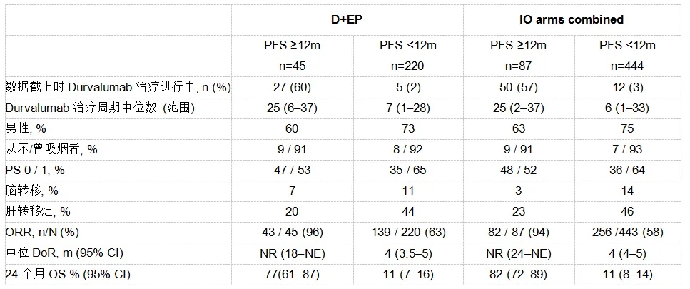 CASPIAN研究中,Durvalumab的加入显著改善了ES-SCLC患者的OS(HR=0.73;95%CI:0.59-0.91,p=0.0047],在EP中加入D±T后,有22%的患者在24个月时仍然存活。今年ESMO报道,该研究将长期临床获益定义为PFS≥12个月,评估了长期获益患者的临床特征以及在ITT人群中TMB与疗效之间的关系。D+EP组45例(17%),D+T+EP组42例(16%),EP组12例(5%)患者的PFS≥12个月(数据截止时间为2020年1月27日),其中女性、PS=0以及较少的脑/肝转移患者中长期获益患者比例较高。同时PFS≥12个月亚组与PFS<12个月亚组相比,接受了更多周期的Durvalumab(中位 25 vs 7)治疗,改善了ORR(96% vs 63%)、中位DOR(NR vs 4个月)和24个月生存率(77% vs 11%)。在全部3个亚组中,283例患者(占ITT的35%)tTMB可评价,但tTMB不能预测D±T+EP与EP(OS、PFS或ORR)的疗效差异。让人惊喜的是,该研究中PFS≥12个月的ES-SCLC患者2年生存率>75%,尽管有些患者基线合并预后较差的脑/肝转移,使用D+EP治疗后获得长期受益的患者仍然比单独使用EP的患者多3倍以上。
