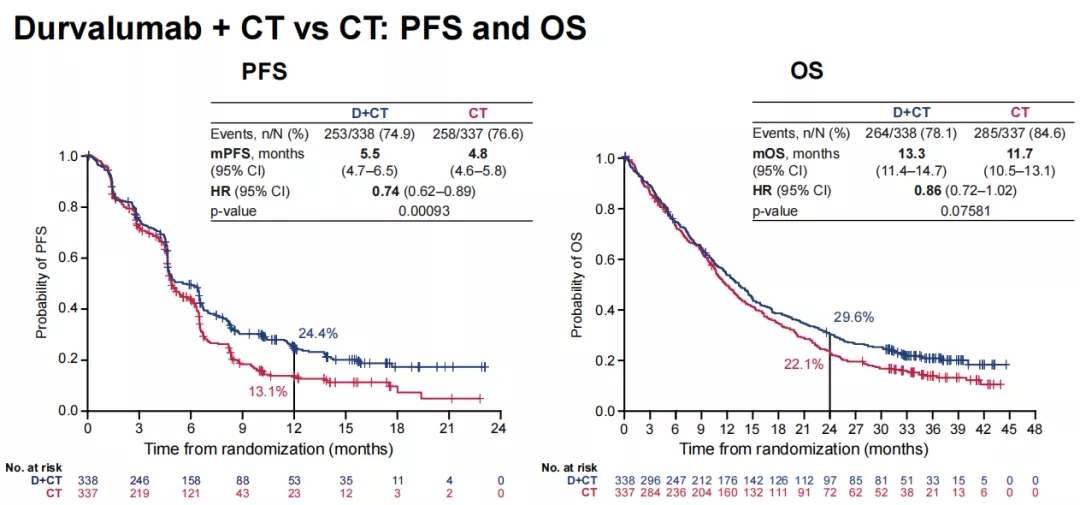 D+CT组对比CT组,PFS延长,OS无获益:D+CT组及CT组的中位PFS分别为5.5个月(95% CI: 4.7-6.5)和4.8个月(95% CI: 4.6-5.8),联合方案显著降低26%的疾病进展风险(HR=0.74; P=0.00093),取得了主要终点的阳性结果。但是D+CT对比CT并未取得OS的获益,分别为13.3个月vs 11.7个月(HR=0.86; P=0.07581)。