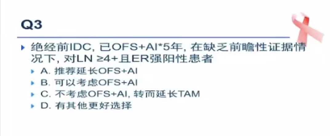 上述试验结果提示延长AI使用时间有获益,延长2-3年是可行的,延长5年获益并未增高。由此,余科达教授提出了第1个问题:绝经后IDC患者在5年辅助内分泌治疗基础上,进一步延长5年AI的必选人群是哪些(不考虑毒副反应) ?