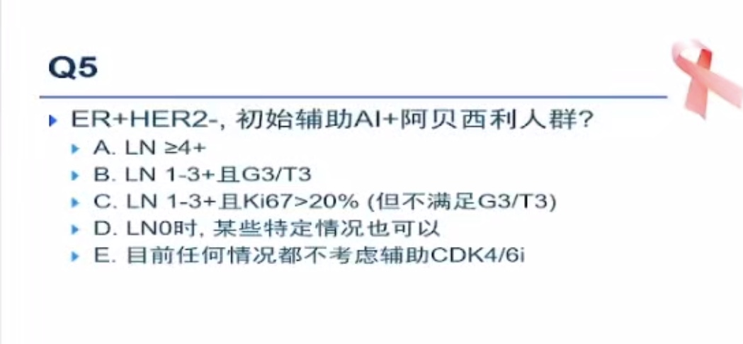 随即,余科达教授提出了第5个问题:ER+/HER2-,初始辅助AI+阿贝西利的人群应该满足什么条件?