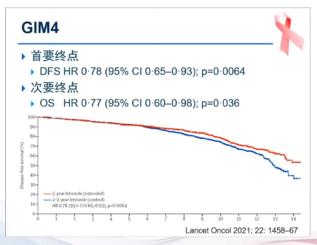 GIM4研究共入组2056例患者,其中68%为pT1,55%为pN0,约一半为中低危患者。中位随访11.7年,主要研究终点为DFS,两条曲线起初重合,在5~6年开始出现差异,两组患者12年DFS率为:62% vs 67%(HR=0.78,95%CI:0.65~0.93;P=0.0064);次要研究终点是OS,两组患者OS率为:84% vs 88%(HR=0.77,95%CI:0.60~0.98,P=0.036)。可以看出在2-3年TAM基础上延长5年AI是有显著获益的。
