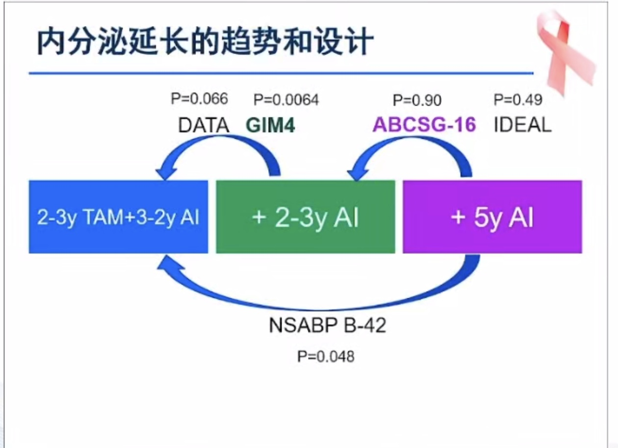 DATA研究和GIM4研究结果可以看出,5年AI的基础上延长2-3年AI有获益倾向,而ABCSG-16研究和IDEAL研究提示,5年AI基础上再延长5年AI这种获益是不明确的。NSABP B-42结果提示,延长AI治疗对比不使用AI是有获益的(P=0.048),但这项研究公布了多次中期分析结果,设定的具有统计学意义的P值为0.0418,所以该项研究也只是提示延长AI治疗具有获益的趋势。