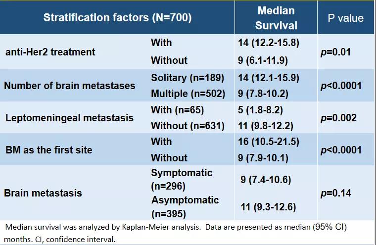 由相关数据我们可以发现,HER2阳性患者确诊后发生脑转移的比例更高,三阴性乳腺癌患者确诊脑转移后生存期是最短的。通过对患者中位生存影响因素进行分析得出,HER2阳性乳腺癌患者有无抗HER2治疗、脑转移数目、是否出现脑膜转移、第一转移部位是否为脑转移都会影响患者的生存,而有无症状出现并不会影响患者的生存时间。