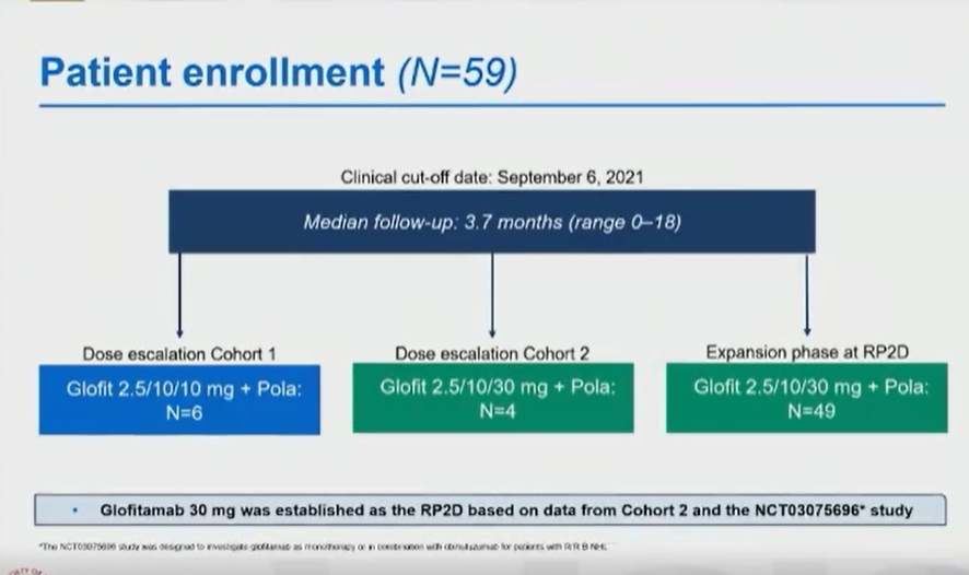 首先介绍的是一项采用双抗(Glofitamab)联合CD79b的ADC药物Polatuzumab Vedotin(Pola)针对复发/难治弥漫大B细胞淋巴瘤的Ⅰb/Ⅱ期临床研究(大会摘要号:525)。Glofitamab是非常重要的抗-CD3和抗-CD20的双抗药物,在之前的Ⅰ期研究已经显示出它对复发难治B细胞淋巴瘤具有一定的挽救治疗价值。同时,联合的药物Pola本身是一种针对CD79b的ADC药物,该项研究主要就是为了验证这两个药物联合的疗效及安全性。