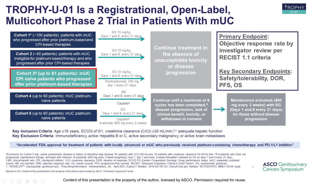 5 Tagawa ST, Balar AV, Petrylak DP, et al. TROPHY-U-01: A Phase II Open-Label Study of Sacituzumab Govitecan in Patients With Metastatic Urothelial Carcinoma Progressing After Platinum-Based Chemotherapy and Checkpoint Inhibitors. J Clin Oncol. 2021;39(22):2474-2485