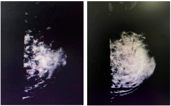 双乳不均匀性致密。左乳上方见巨大等密度肿物影,形态欠规则,边缘模糊,大小约5.5cm×2.0cm,未见可疑钙化;右乳未见明显肿物影,未见可疑钙化。左腋下见增大、致密淋巴结影。