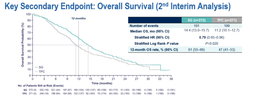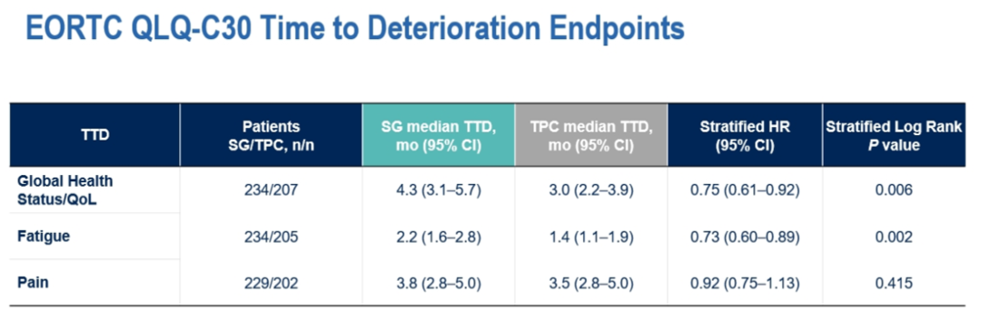 这一结果非常令人兴奋,因为统计分层设计让我们看到了总生存率和生活质量方面的差异。结果显示,接受SG治疗的患者有更好的获益,临床获益率和反应持续时间也长。与接受TPC治疗的患者相比,接受SG治疗的患者报告结局中全球健康状况的生活质量和至疾病恶化时间明显更长。