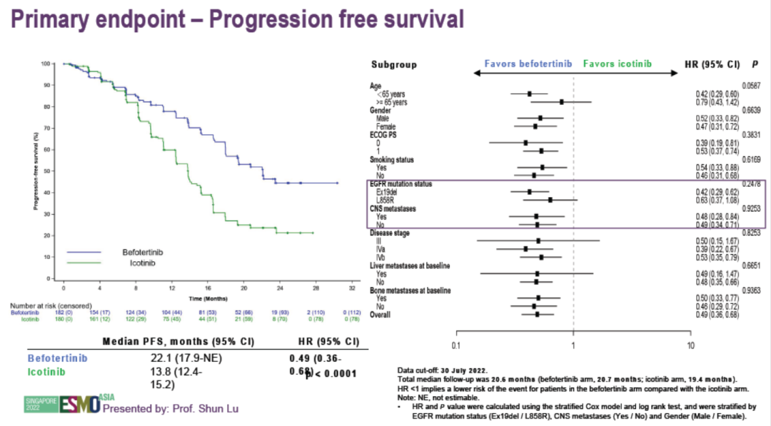 数据发现,两组中位PFS分别为22.1个月和13.8个月,HR=0.49,P<0.0001,亚组分析发现不同临床病理特点的患者均可以从贝福替尼的治疗中获益。