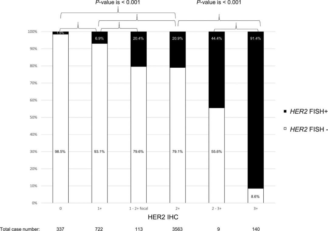 作为病理学上所有新诊断乳腺癌的常规检测,高效益成本比的HER2检测策略为首先对所有新诊断乳腺癌进行IHC检测(筛查),其次对HER2 IHC 2+患者进行FISH检测(确认/后续检测)。对于IHC 0或1+,以及HER2 IHC为阳性(IHC 3+)的浸润性乳腺癌,通常不需要进行HER2 FISH检测。尽管HER2 IHC和FISH检测大多一致,但仍有小部分患者(~1.5%)的HER2 IHC和FISH结果不一致(即HER2 IHC阴性而FISH阳性);但这些患者进行抗HER2靶向治疗后,仍能达到完全缓解或部分缓解。鉴于生物统计分析流程的进步,NGS DNA数据可同时提供体细胞突变和拷贝数变异结果(如增益、扩增、丢失)。这项研究通过进一步比较HER2 NGS和FISH检测的一致性,以确认NGS的HER2扩增状态是否可用于筛选IHC阴性但FISH阳性的HER2阳性乳腺癌人群。