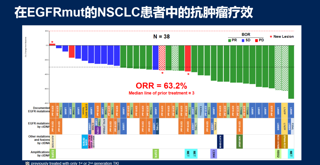 38例EGFR突变NSCLC患者的ORR高达63.2%,这些患者经过中位3线治疗,其中34例患者既往接受了三代EGFR-TKI治疗后耐药。