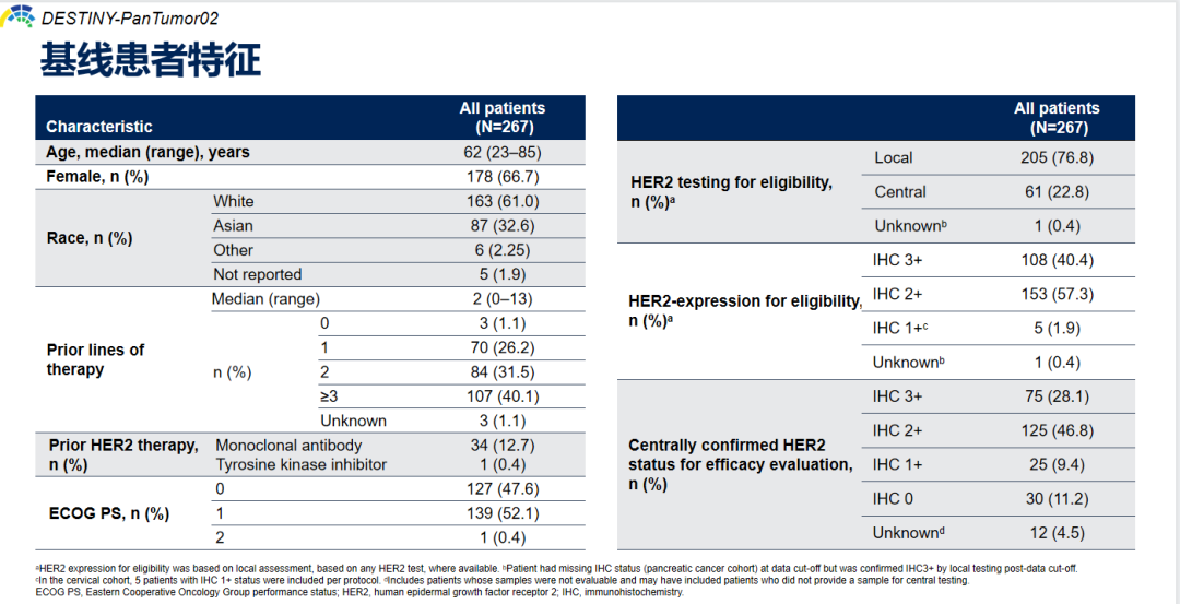 DESTINY-PanTumor02是一项全球、多中心、开放标签的Ⅱ期临床试验,旨在评估T-DXd(5.4 mg/kg)用于治疗既往接受过治疗的局部晚期或转移性HER2表达实体瘤的疗效和安全性。入组患者包括:不适合根治性治疗的晚期实体瘤患者;2L+患者人群;地方检测或中心实验室检测的HER2表达(IHC 3+/2+),允许患者既往接受过抗HER2治疗。主要终点为研究者评估确认的客观缓解率(ORR),次要终点包括持续缓解时间(DoR)、疾病控制率(DCR)、无进展生存期(PFS)、总生存期(OS)、安全性。