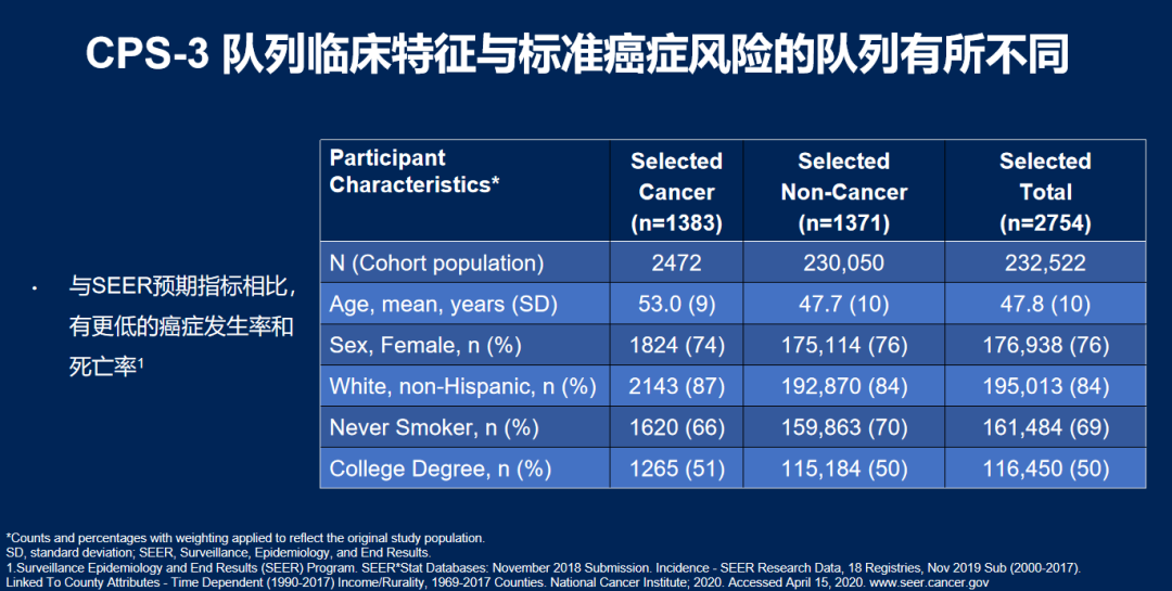在268 726例CPS-3参与者中,2850例被选择并通过队列抽样进行了分析,2754例被纳入主要分析集。CPS-3队列人口统计学和癌症发病率模式、流行病学与SEER数据库相比,更年轻、更健康。