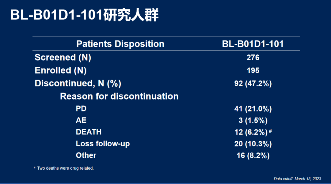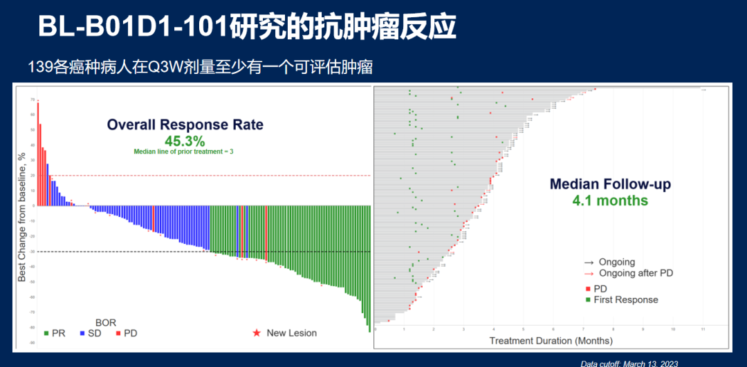 BL-B01D1是一种首创的新型抗体药物结合物(ADC),由一种EGFR×HER3双特异性抗体通过可切割接头与新型TOP-Ⅰ抑制剂有效载荷相连。首次在人体(FIH)试验(BL-B01D1-101)中评估了其在实体瘤患者中的安全性、耐受性和初步疗效。来自中山大学肿瘤防治中心的张力教授在ASCO大会上披露了BL-B01D1治疗局部晚期/转移性实体瘤Ⅰ期研究数据。