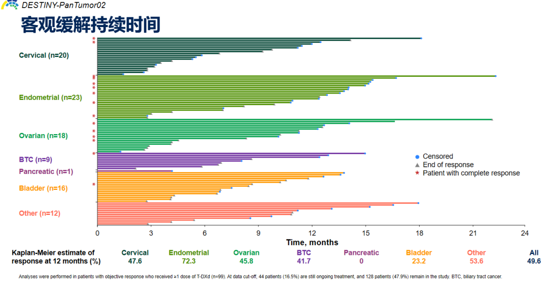 研究结果显示,99例(37.1%)患者达到ORR,其中15例(5.6%)患者达到完全缓解(CR)。12周的DCR为68.2%,中位DOR(mDOR)为11.8个月。大多数实体瘤队列均显示出较好的ORR获益,其中包括20例(50.0%)宫颈癌、23例(57.5%)子宫内膜癌、18例(45.0%)卵巢癌、9例(22.0%)胆道癌、16例(39.0%)膀胱癌和12例(30.0%)其他瘤种患者。并且,在总人群中观察到49.6%的患者在一年后仍获得持续缓解。