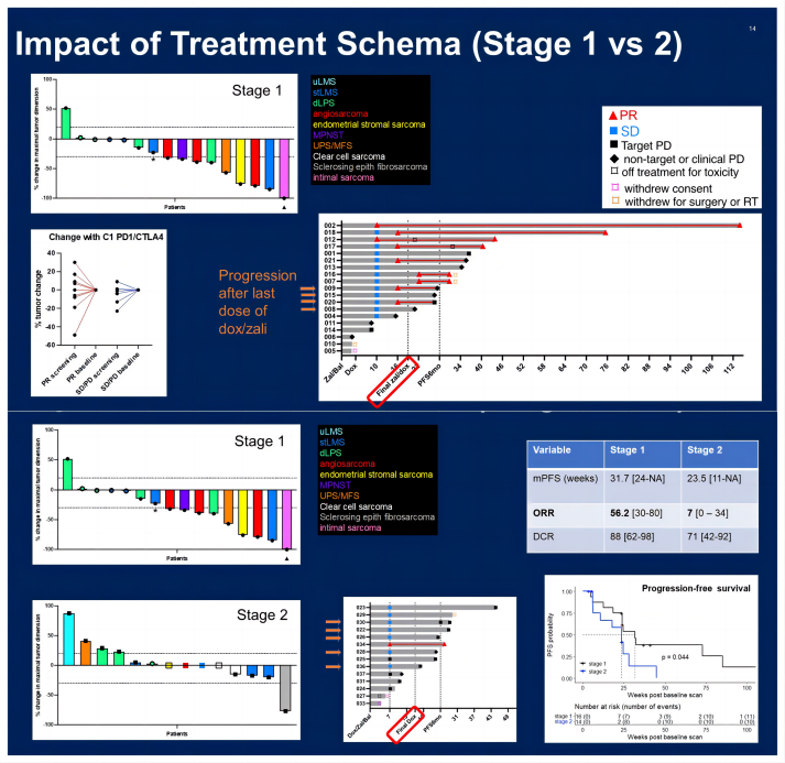 该研究采用多柔比星联合双免治疗(CTLA-4+PD-1),在多种肉瘤亚型中均观察到疗效。值得探讨的是,此研究中第一阶段患者疗效更佳,即“先双免后联合DOX”优于“三药同时启动”。这一结果与前述研究恰好有所不同,化免联合究竟应该“先免后联”,还是“先化后联”,为何均优于直接联合,这是一个非常有意思的问题。