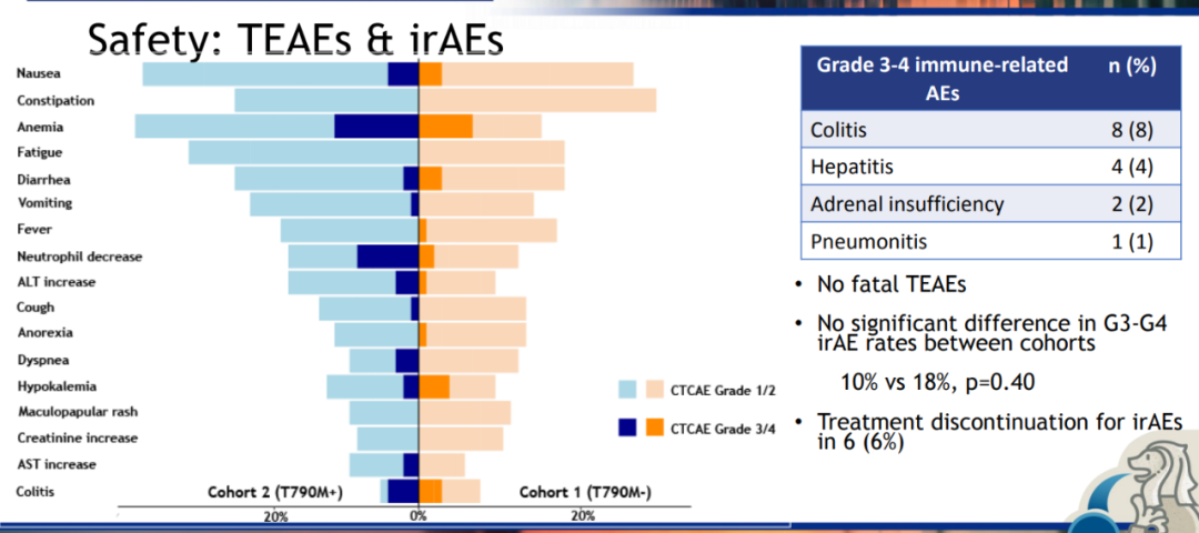 没有5级免疫相关不良反应。17例(17%)患者报告了3-4级免疫相关不良反应(irAE),包括结肠炎(8%)、肝炎(4%)、肾上腺功能不全(2%)和肺炎(1%)。6例(6%)患者因出现虹膜AE而停止了研究治疗。两组患者的3-4级irAE发生率无明显差异(10% vs 18%,P=0.40)。