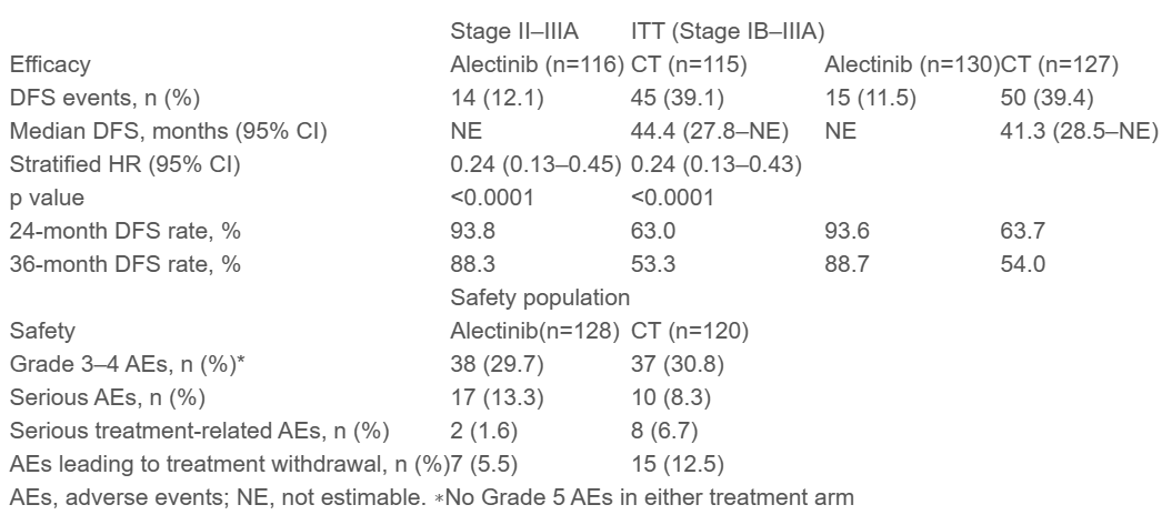 LBA2-ALINA:一项针对早期ALK+NSCLC治疗疗效和安全性的研究带来了重大突破。对于手术切除的IB~ⅢA期ALK+NSCLC患者,辅助阿来替尼治疗优于化疗,带来更长的无病生存期(DFS)和更好的长期缓解机会。这些发现展示了阿来替尼作为首选一线治疗的潜力。