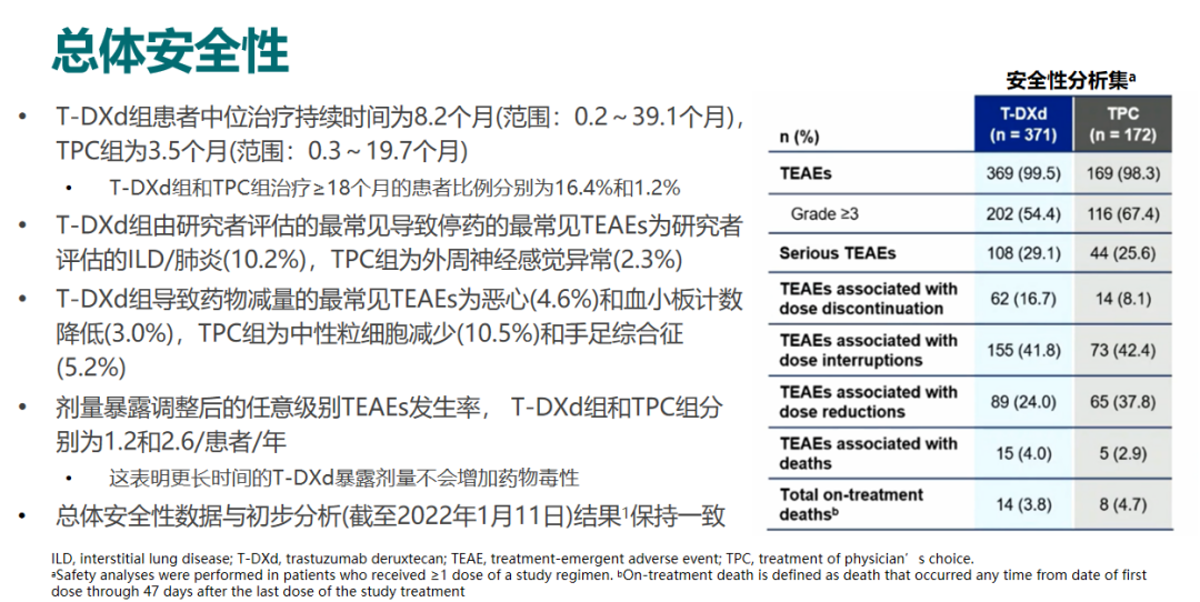 T-DXd组和TPC组的中位持续治疗时间分别为8.2个月和3.5个月。T-DXd组的≥3级治疗期间不良事件(TEAEs)发生率低于TPC组(54.4%vs 67.4%);导致减剂量的TEAEs发生率同样低于TPC组(24.0%vs 37.8%),且T-DXd组常见的减剂量TEAEs为恶心(4.6%)和血小板计数减少(3.0%),而TPC组为中性粒细胞计数减少(10.5%)和手足综合征(5.2%)。