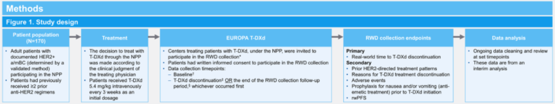 2021年,欧洲启动了一项T-DXd的患者特定用药项目(Named patient program,NPP)。EUROPA T-DXd研究[1]正是基于这个NPP项目,入组来自爱尔兰、意大利和西班牙的多中心单臂真实世界研究。由于当时还没有报道DB-03、DB-04研究,因此EUROPA T-DXd研究入组的是既往过≥2线抗HER2治疗(与DB-01、DB-02研究相似)。主要终点是真实世界至T-DXd治疗中断时间(rwTTD),次要终点包括既往治疗模式、治疗中断原因、不良事件、真实世界无进展生存期(rwPFS)等。