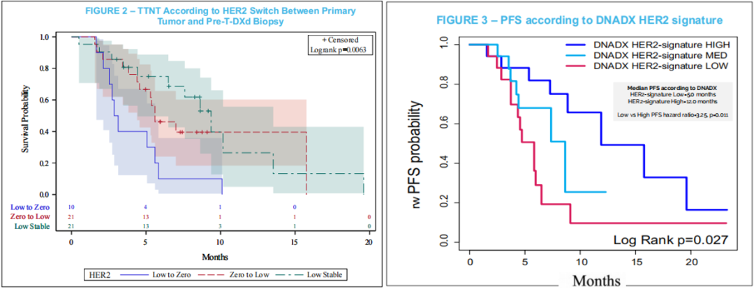 HER2+、HER2-Low、HER2-0患者中位至下一线治疗时间(TTNT)分别为10.4个月、7.6个月和3.7个月,OS分别为23.1个、14.2个月和9.5个月。作者将T-DXd治疗前原发肿瘤HER2状态分为HER2-Low转换为HER2-0、HER2-0转换为HER2-Low、稳定HER2-Low,中位TTNT分别为3.0个月、5.6个月和9.4个月;T-DXd治疗前首次转移性病灶同样分为这三种HER2状态,中位TTNT则分别为8.5个月、5.4个月和8.6个月。作者还分析了HER2基因状态对T-DXd的影响,在HER2-肿瘤中,有或无ERBB2半合子缺失的患者,其TTNT没有显著差异(4.1 vs 7.6个月,P=0.41);DNADX HER2基因检测高危患者的TTNT相较于中、低危患者更好。
