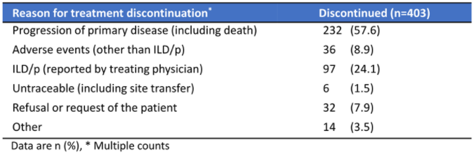 间质性肺病/非感染性肺炎(ILD/p)是临床医生最为关注的不良事件。一项来自日本的大样本上市后监测研究[4],分析了1204例使用T-DXd治疗的患者数据。在403例治疗中断的患者中,除了疾病进展(n=232,57.6%)以外,ILD/p(n=97,24.1%)是最常见的原因。