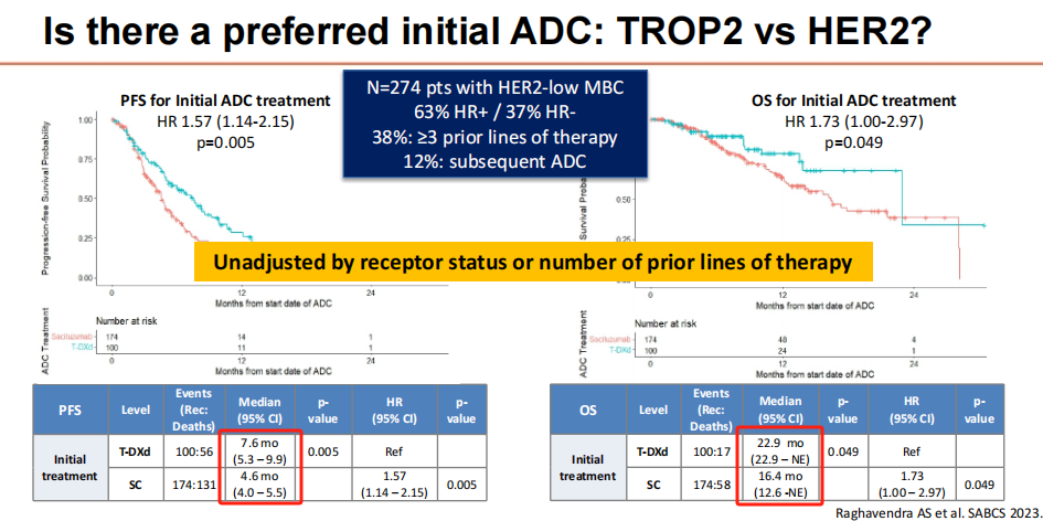A.Raghavendra报道的MD安德森癌症中心的真实世界研究[8]中,分析了274例HER2-Low mBC患者(T-DXd组100例,SG组174例),38%接受过≥3线治疗。研究结果显示:以T-DXd为ADC初始治疗的患者,其PFS(7.6 vs 4.6个月,P=0.005)和OS(22.9 vs 16.4个月,P=0.049)显著更长;但在33例ADC序贯治疗的患者中,无论是SG序贯T-DXd还是T-DXd序贯SG,二者的PFS(HR 1.02,P=0.97)和OS(HR 0.78,P=0.84)均无显著差异。从这些真实世界数据来看,以T-DXd作为HER2-Low mBC初始治疗的生存获益更好,但T-DXd和SG不同序贯使用的生存获益并无显著差异,选择其他靶点和载药机制的ADC可能才是合理的治疗策略。