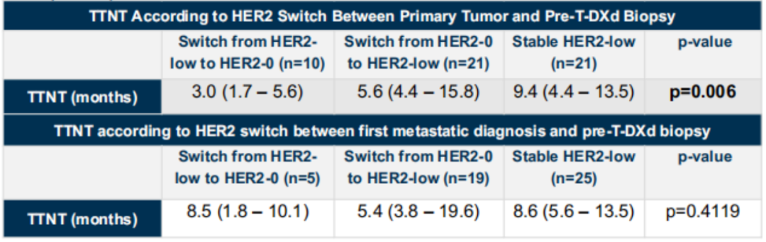 靶点突变最直接的生物学表现是影响分子表达的稳定性。众所周知,HER2是乳腺癌的驱动基因,且HER2表达具有时空异质性。本次SABCS大会报道的RELIEVE研究[9]分析了196例患者(包括126例HER2+,44例HER2-Low,21例HER2零表达),总体上T-DXd稳定的患者治疗获益更好,至下一线治疗时间(TTNT)更长,但无论是原发病灶(21/44)还是转移病灶(25/44),仅有大约一半的患者为HER2-Low稳定,而且HER2-0转变为HER2-Low的患者TTNT短于HER2-Low稳定的患者;另外在原发灶HER2-0患者中,也有一半(10/21)的患者是由HER2-Low转变为HER2-0。