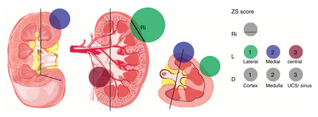 虽然肿瘤大小在评估中具有重要地位,但是肿瘤的位置同样不容忽视。所以我们开发了中国首个自主开发的肾癌手术评分系统“中山评分系统(ZS Score)”,评估指标包括与手术难度相关的肾内最大肿瘤直径(Ri)、肿瘤位置(Loation)和肿瘤深度(Depth)等[1]。累积得分越高,手术难度越大;而得分越低代表手术时间短,出血量少,并发症少,复发率低。其次,我们还优化了不阻断肾动脉(零缺血)保留肾单位手术(off-clamp NSS)的评分系统,并提出了零缺血指数(ZII);由于肿瘤的血供主要在肾柱部位,该评分体系主要根据肿瘤侵犯肾柱的数量进行分级。