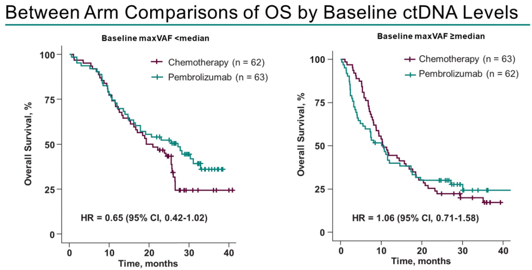 基线ctDNA水平似乎可预测帕博利珠单抗疗效。在第1个治疗周期内ct DNA的降低与治疗结局有关。不同治疗方案的ct DNA反应不同,并且与长期临床结局存在更强的相关性。当调整肿瘤反应时,帕博利珠单抗和化疗的OS相关性均未保留。除放射学评估肿瘤大小变化外,ct DNA的早期动态未能预测其他额外获益情况。